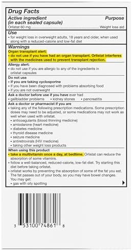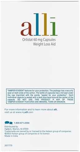 alli (orlistat 60 milligram capsules) is your smart edge for weight loss. Among weight loss products, it’s the only FDA-approved over-the-counter weight loss aid. Orlistat, the active ingredient in alli, is a lipase inhibitor and works by binding to specific enzymes that break down fats. As a result, about 25 percent of the fat you consume is not absorbed and passes through the digestive system. Since the calories associated with this unabsorbed fat are not used, the number of calories that enter your system is reduced. You’re ready with alli by your side. alli (orlistat 60 milligram capsules) is a weight loss aid for overweight adults, 18 years and older, when used along with a reduced-calorie and low-fat diet. Read and follow label directions. alli orlistat 60 mg capsules weight loss pill starter pack (60 capsules) contains: A read me first brochure, pill carrying case, and up to 20-day supply. It is designed for people who have not previously used alli. Helps you lose more weight than dieting alone. Read the enclosed brochure for other important information. Diet and exercise are the starting points for any weight loss program.